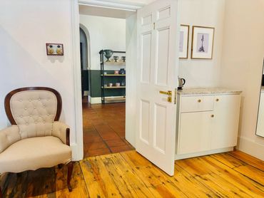 This spacious room with its high ceiling and original wooden flooring can accommodate four guests.